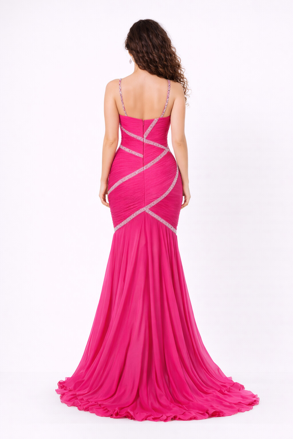 Make a powerful style statement with this Hot Pink Embellished Mermaid Gown, designed to steal the spotlight. Featuring dazzling crystal detailing in a sculpted wrap pattern, this gown beautifully enhances the waist and curves. The fitted silhouette flows into a soft, flared hem that adds drama and elegance with every step.