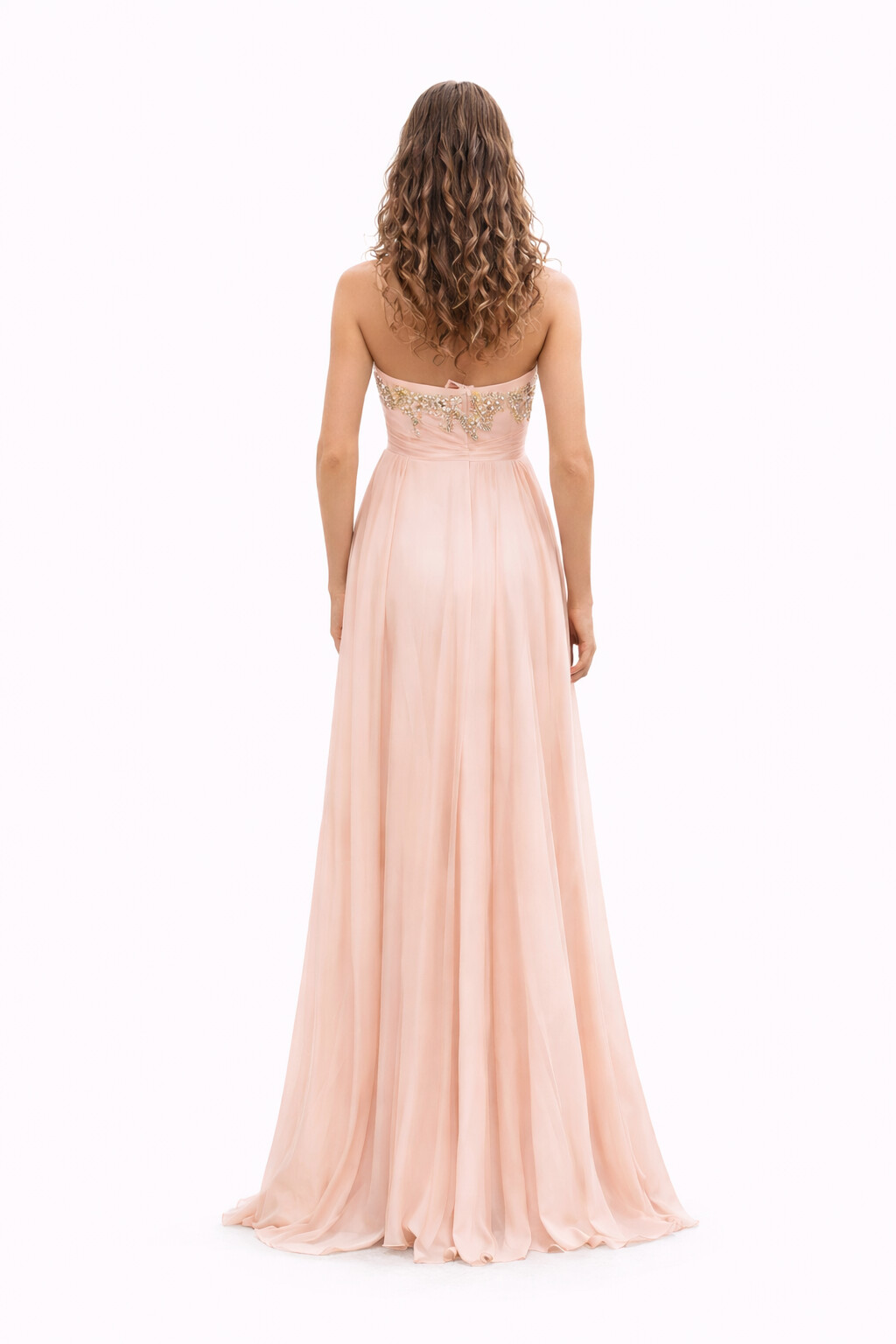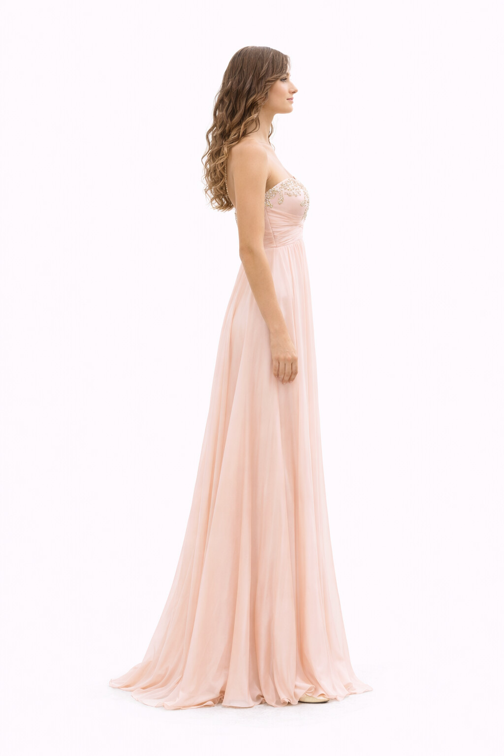 Peach chiffon gown with gold bead detailing and soft movement.